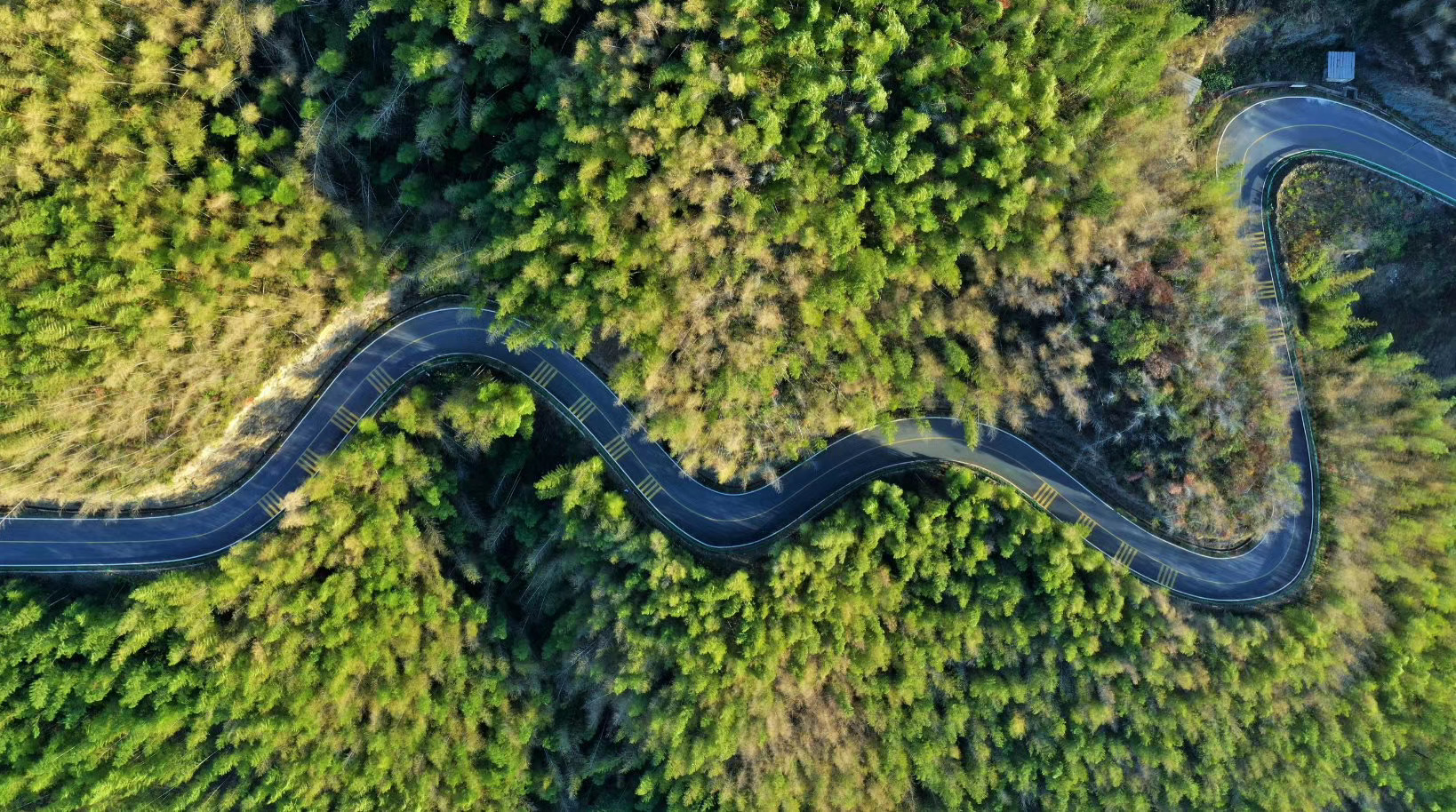 路若盤龍環(huán)戲水,雨灑叢林濕落花。